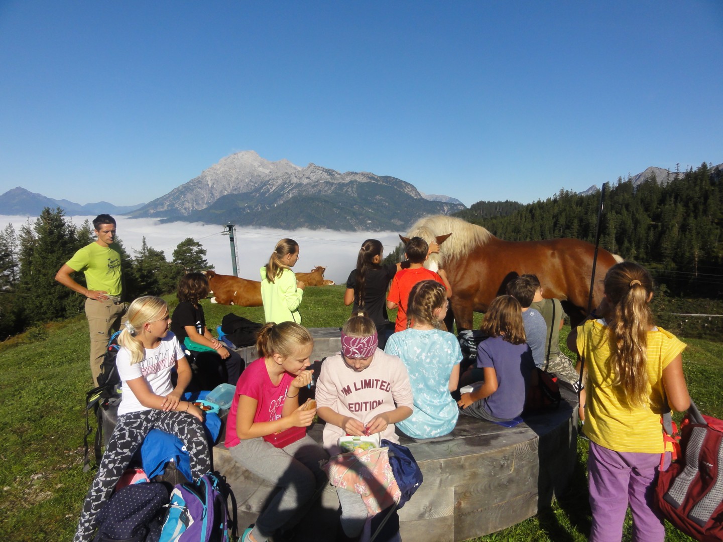 Nach einer ereignisreichen Schulwoche mit dem 1. Schultag, dem Willkommensprojekt der 1. und 5. Klassen, machte sich die 1S am Freitag auf den Weg zur Steinalm. Beeindruckt von der tollen Kulisse mit dem Nebelmeer über Saalfelden und dem Steinernen Meer im Hintergrund, gestaltete sich der Rückweg über Bachwinkl als freudige Erwartung auf die Grillerei am Schulgelände. Ein schöner gemeinsamer Abschluss der 1.Schulwoche!