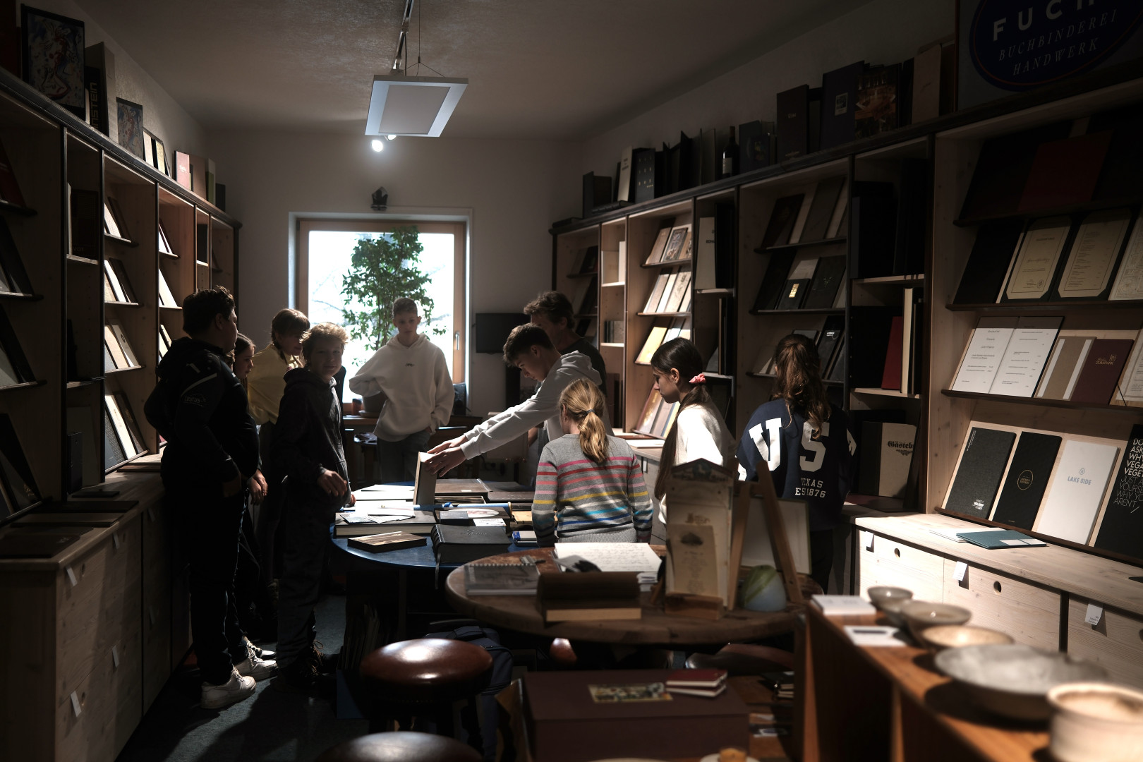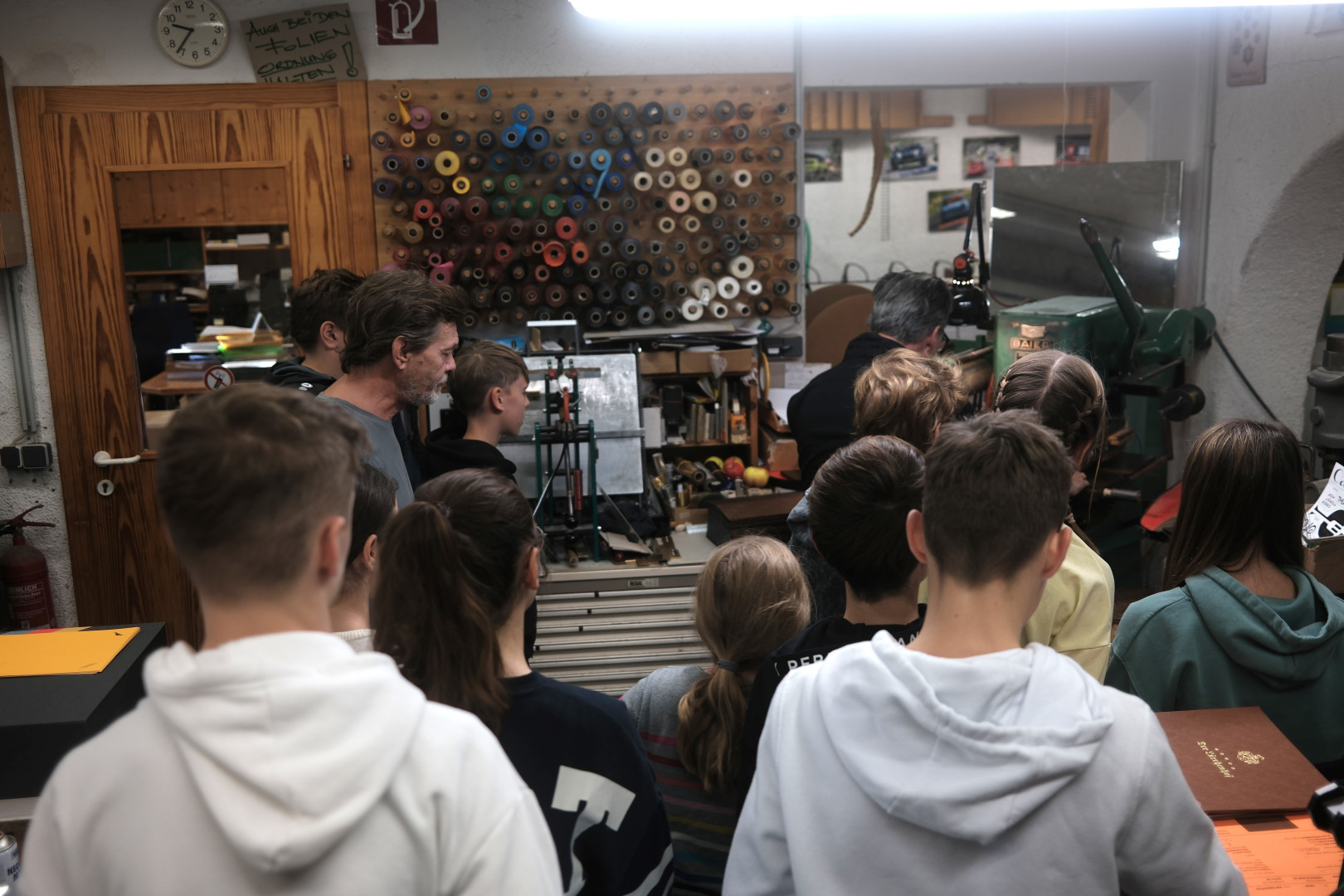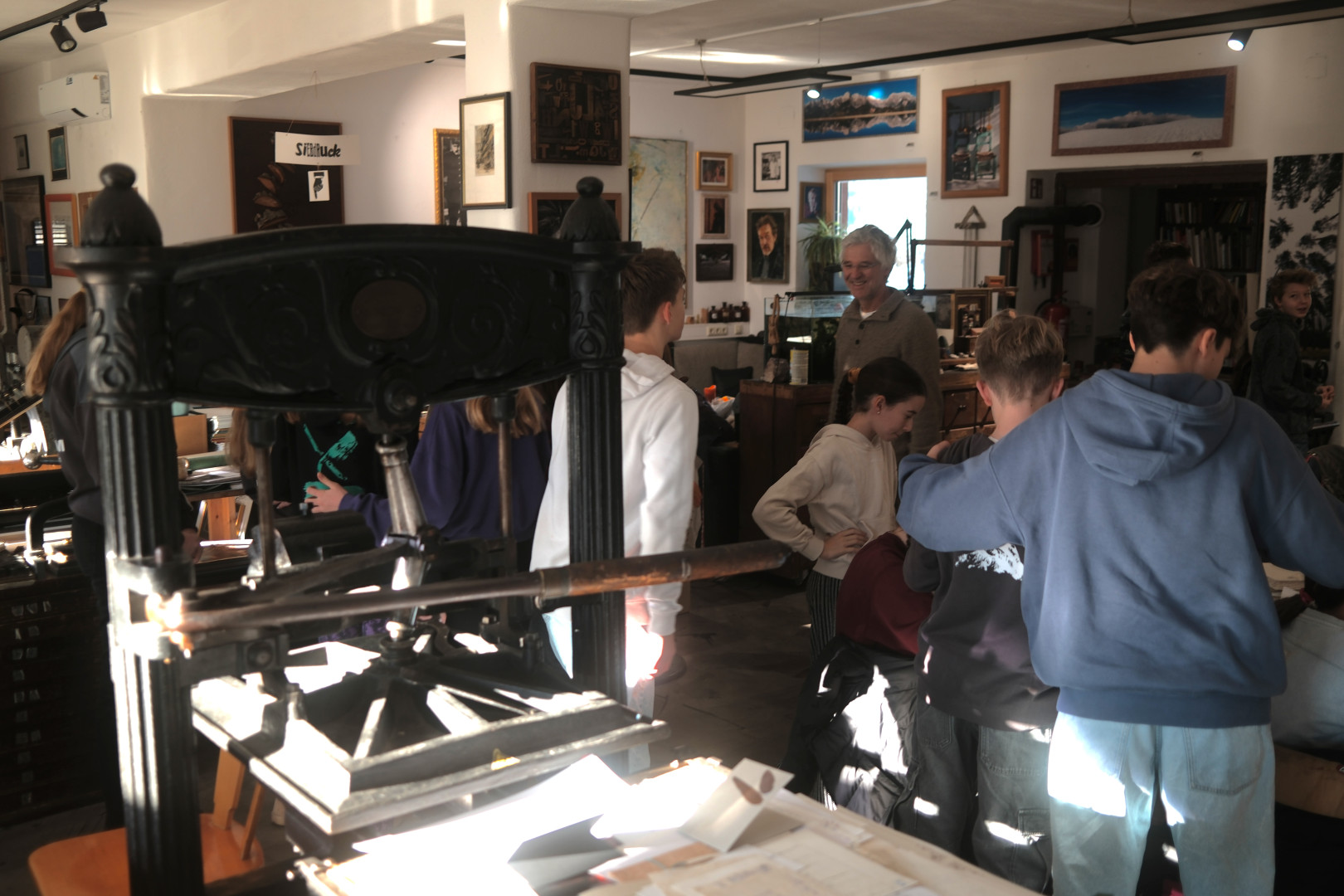 Am Dienstag, den 18. November, besuchte die 3w im Rahmen des Projekts „Kunsthandwerk Buchbinden“ im Unterrichtsfach Kunst und Gestaltung die Buchbinderei Fuchs in Saalfelden. Dabei hatten die Schüler:innen neben einer Führung durch die verschiedenen Werkstätten auch die Möglichkeit, eine Karte selbst zu bedrucken. Diese Exkursion war eine tolle Gelegenheit, über die Erfahrungen des Buchbindens in der Schule hinaus einen lokalen Betrieb kennenzulernen und die vielfältigen handwerklichen Arbeitsprozesse, die in diesem Kunsthandwerk vorkommen, näher zu erleben.