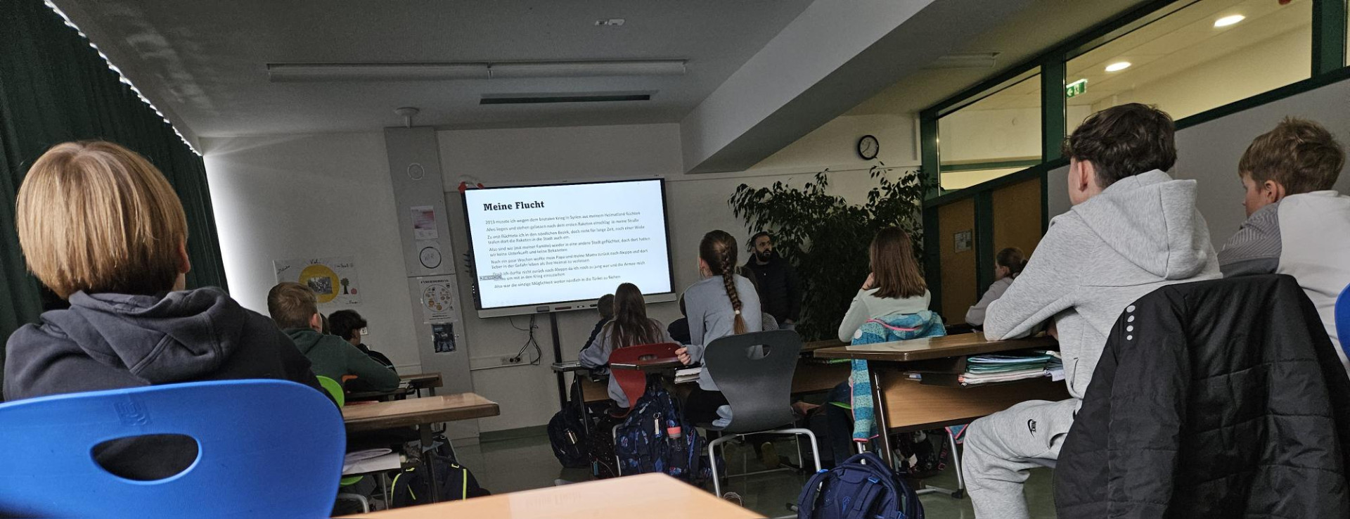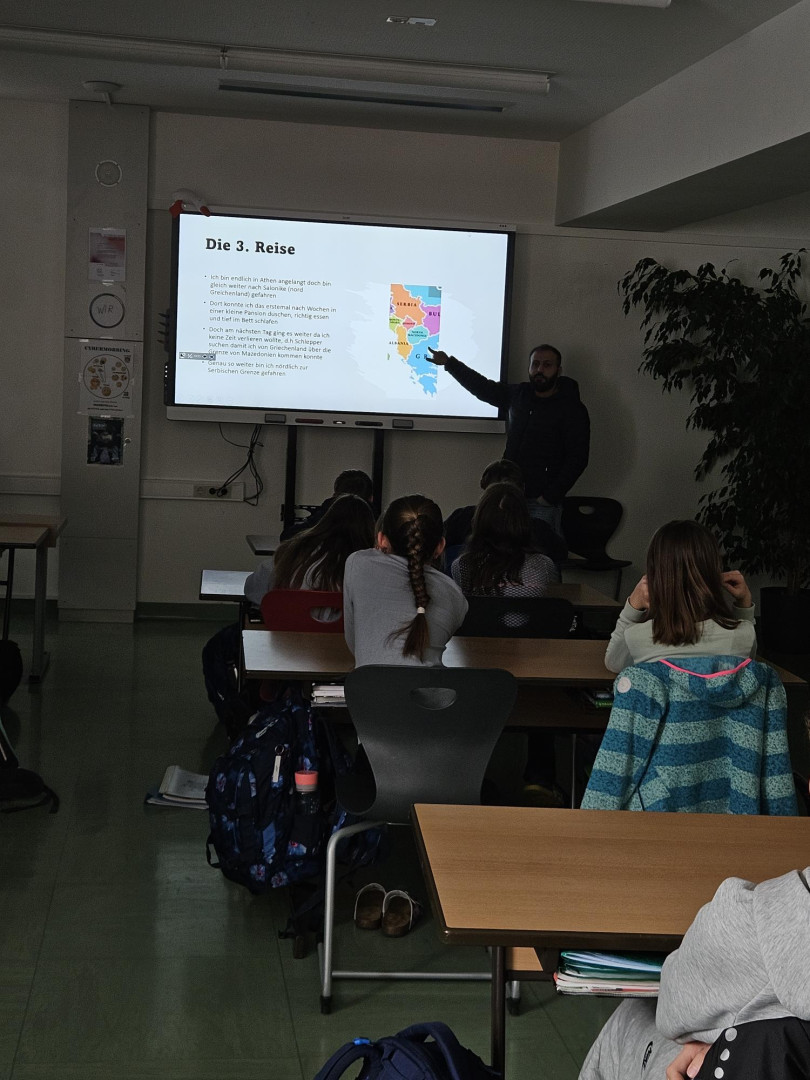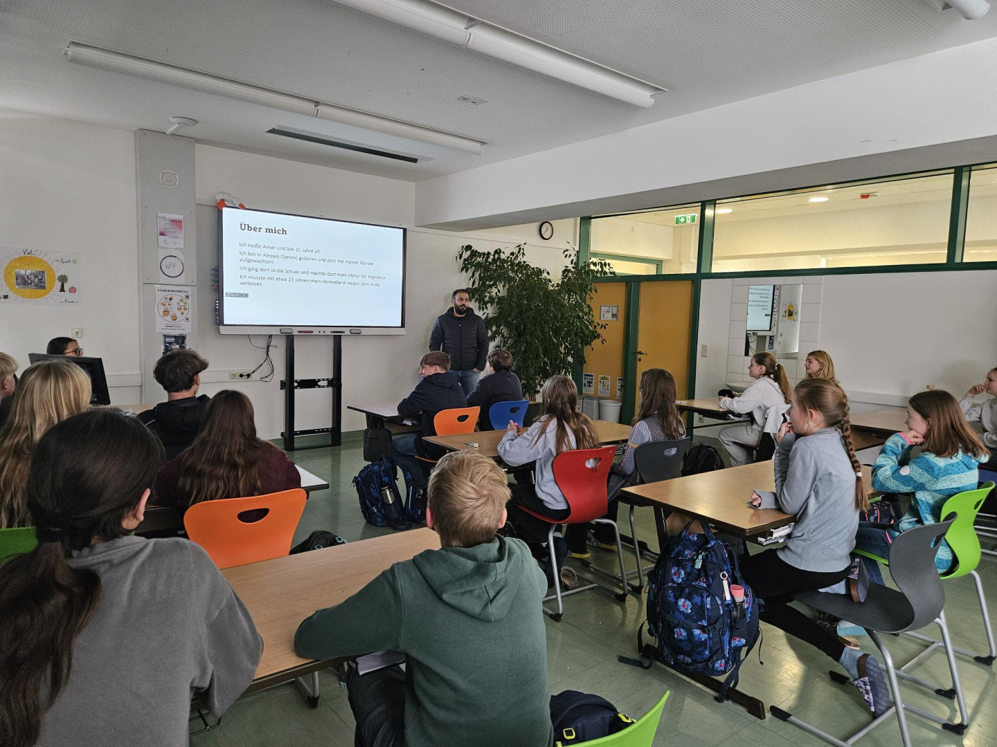 Am Donnerstag, dem 27.11.2025, hatte die 3n Besuch von Amer. Amer musste aufgrund des Krieges aus seiner Heimat flüchten und hat uns mit einer Powerpointpräsentation von seiner Flucht erzählt.