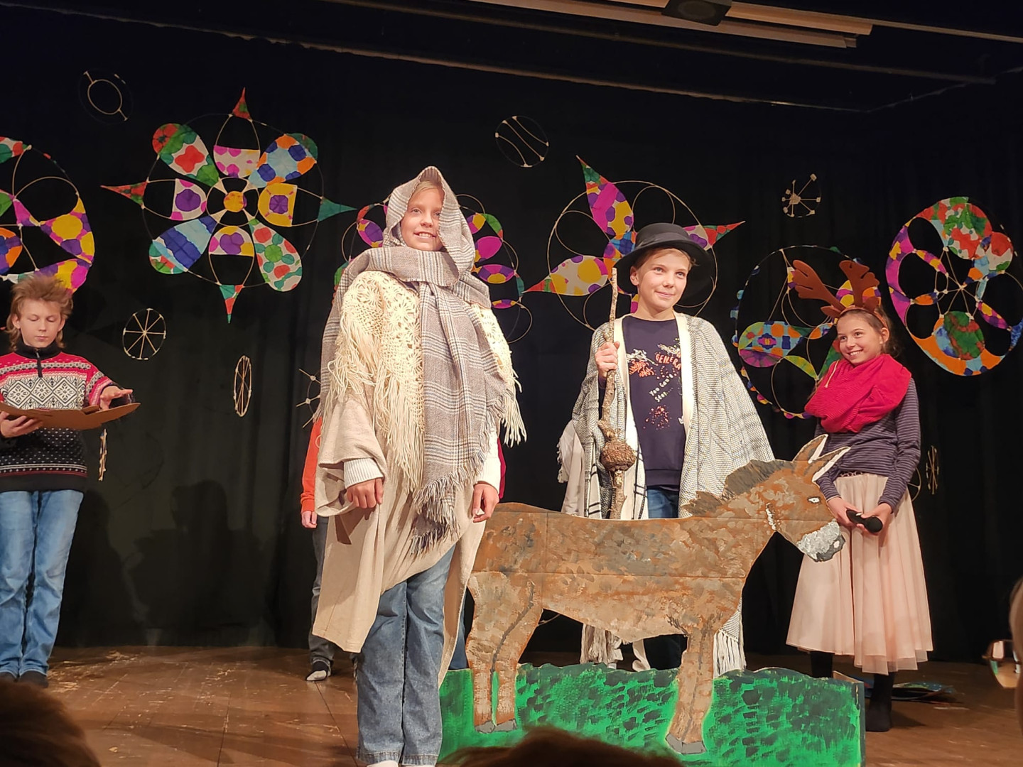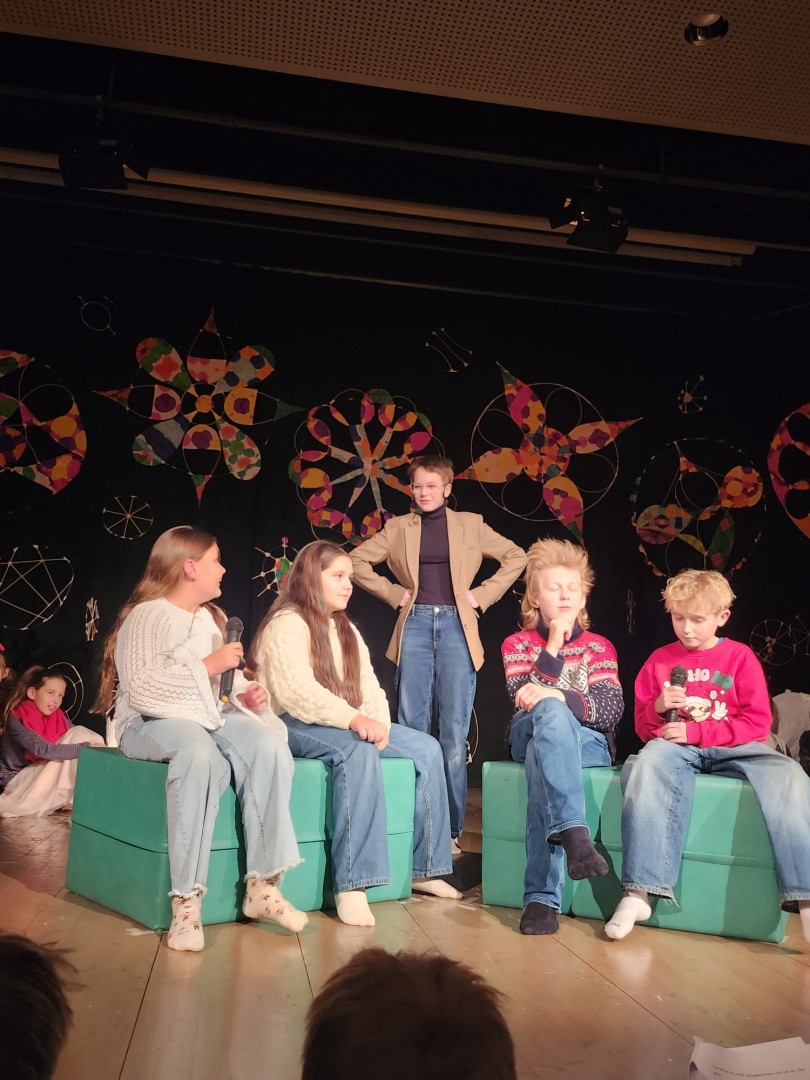 Von 18.12. bis 22.12. fand an unserer Schule wieder das alljährliche Weihnachtsprojekt der ersten Klassen statt. 101 Erstklässler:innen arbeiteten in fünf verschiedenen Gruppen: Bühnenbild, Theater, Schreibwerkstatt, Chor und Tanz und bereiteten mit viel Kreativität und Begeisterung beeindruckende Beiträge vor.