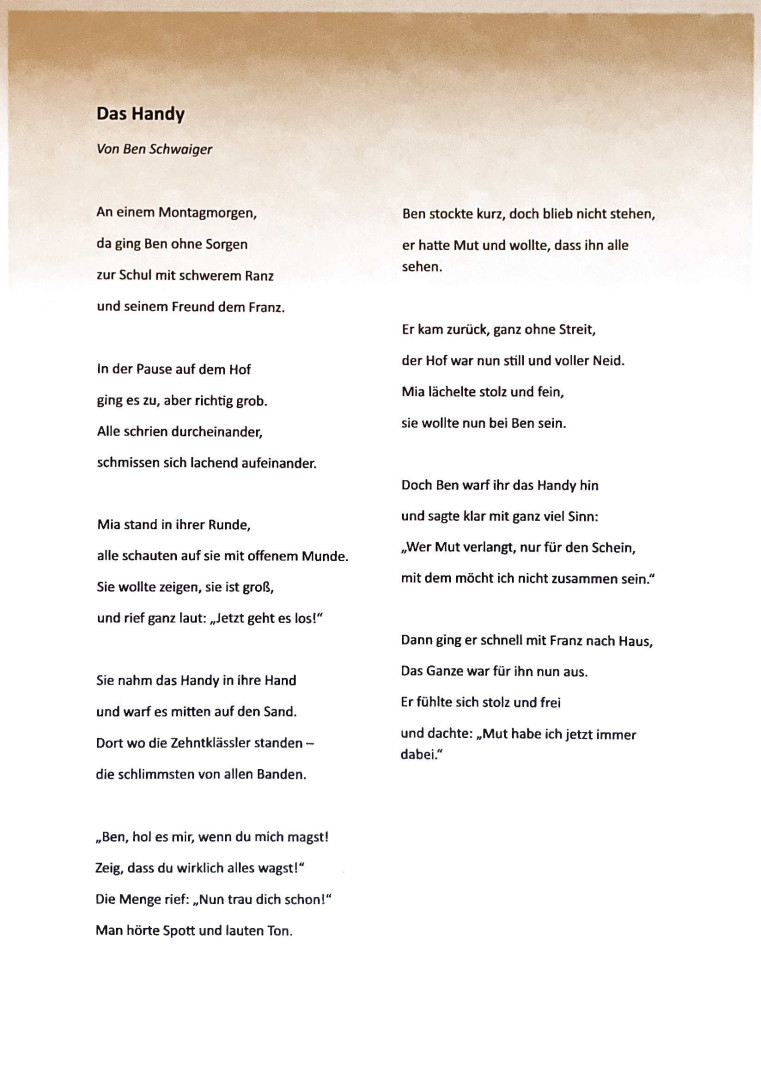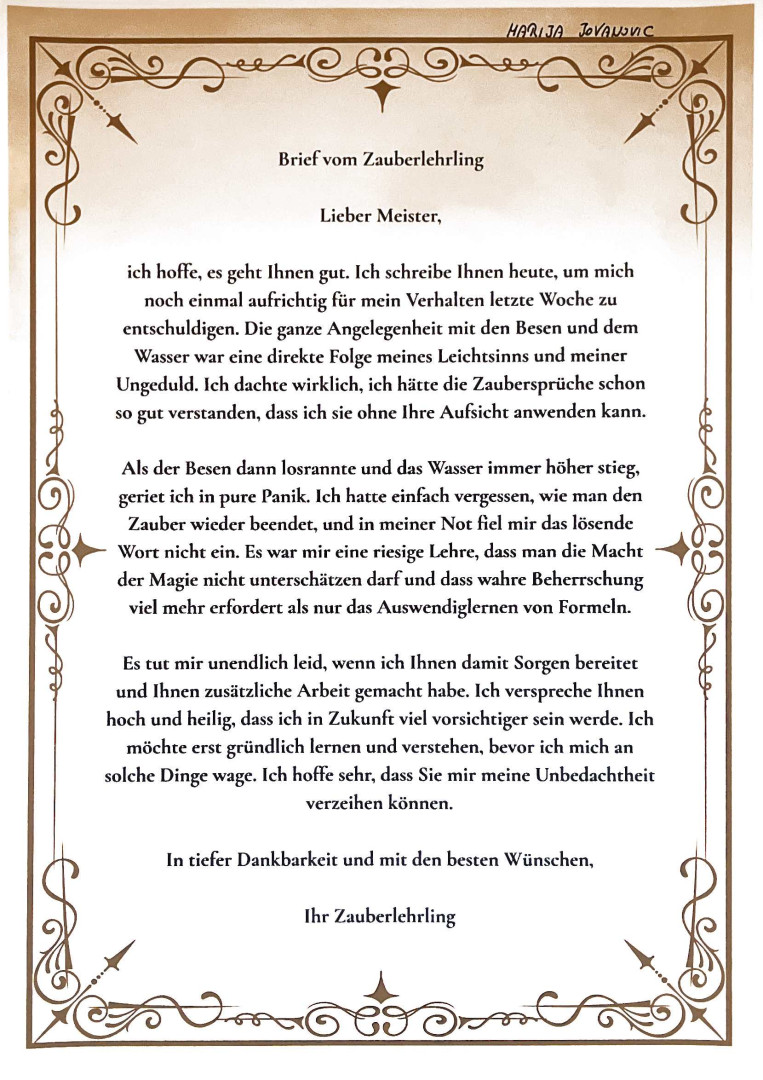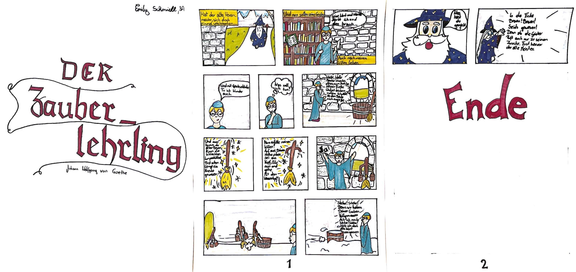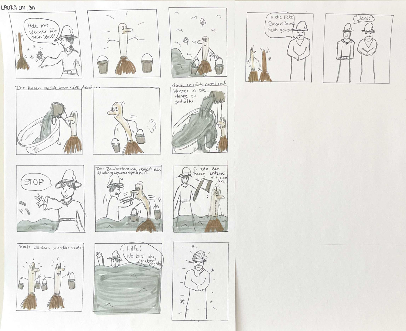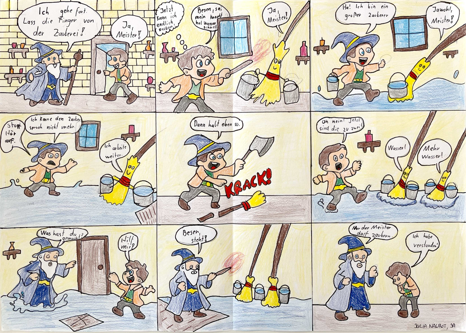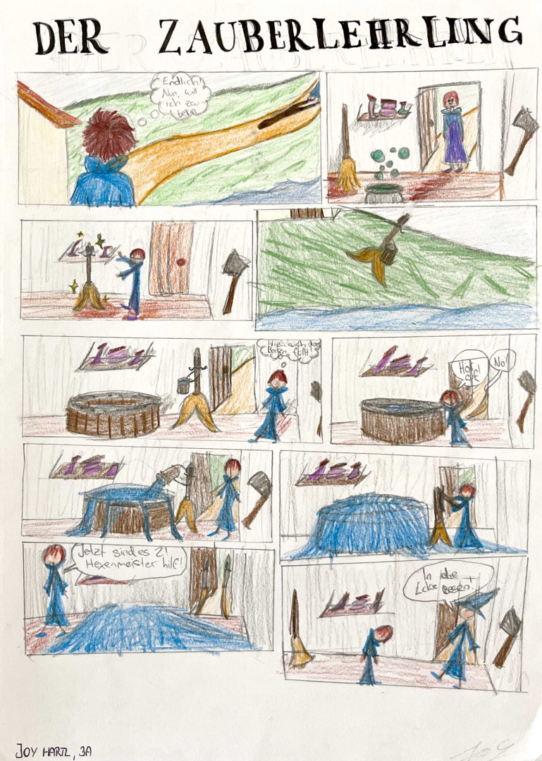Im Rahmen des Deutschunterrichts haben sich die Schüler*innen der 3A auf kreative Art und Weise mit klassischen Balladen beschäftigt. Behandelt wurden unter anderem „Der Zauberlehrling“ von Johann Wolfgang von Goethe sowie „Der Handschuh“ von Friedrich Schiller. Die Schüler*innen konnten zwischen verschiedenen Aufgabenstellungen wählen und zum Beispiel eine der Balladen als Comic darstellen, eine modernisierte Version erfinden oder einen Brief an das Fräulein Kunigund beziehungsweise den Zaubermeister schreiben.